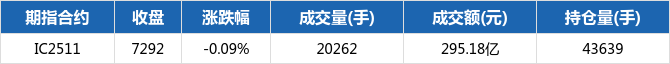 中证500期指当月合约IC2511报收7292点,下跌6.4,跌幅0.09%。成交量20262手,成交额295.18亿元,持仓43639手,较上一交易日减少3223。