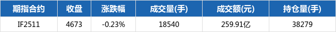 期指主力合约11月7日全跌。其中,沪深300期指当月合约IF2511报收4673点,下跌10.6,跌幅0.23%。成交量18540手,成交额259.91亿元,持仓38279手,较上一交易日减少3055。
