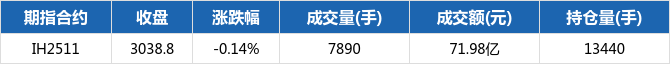 上证50期指当月合约IH2511报收3038.8点,下跌4.2,跌幅0.14%。成交量7890手,成交额71.98亿元,持仓13440手,较上一交易日减少860。