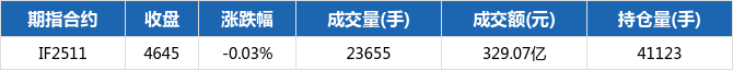 期指主力合约11月12日涨跌互现。其中,沪深300期指当月合约IF2511报收4645点,下跌1.4,跌幅0.03%。成交量23655手,成交额329.07亿元,持仓41123手,较上一交易日增加1747。
