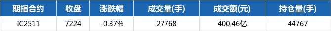 中证500期指当月合约IC2511报收7224点,下跌26.6,跌幅0.37%。成交量27768手,成交额400.46亿元,持仓44767手,较上一交易日增加2741。