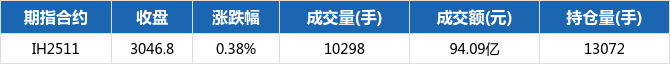 上证50期指当月合约IH2511报收3046.8点,上涨11.6,涨幅0.38%。成交量10298手,成交额94.09亿元,持仓13072手,较上一交易日增加165。