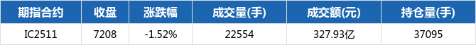 中证500期指当月合约IC2511报收7208点,下跌111.4,跌幅1.52%。成交量22554手,成交额327.93亿元,持仓37095手,较上一交易日减少1650。