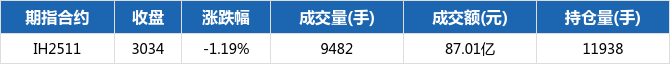 上证50期指当月合约IH2511报收3034点,下跌36.6,跌幅1.19%。成交量9482手,成交额87.01亿元,持仓11938手,较上一交易日减少824。