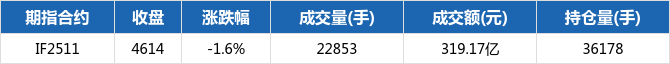 期指主力合约11月14日全跌。其中,沪深300期指当月合约IF2511报收4614点,下跌75,跌幅1.6%。成交量22853手,成交额319.17亿元,持仓36178手,较上一交易日减少424。
