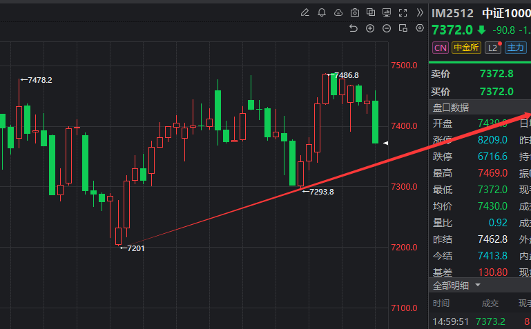 中证1000(im)2512合约,思路还行,昨天和今天的都可以止盈、不管你是开盘7440,还是反弹后7450 7460附近进的,尾盘都是可以止盈的,目前还是需要注意60分钟趋势线支撑大概在7330-7350附近,会随着时间的推移而上移,这个趋势破位就可以继续做空,这个趋势不破位则可以多、