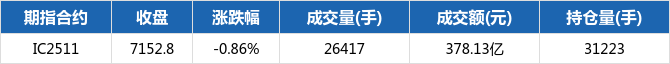 中证500期指当月合约IC2511报收7152.8点,下跌62.4,跌幅0.86%。成交量26417手,成交额378.13亿元,持仓31223手,较上一交易日减少1529。