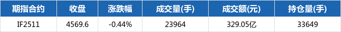 期指主力合约11月18日全跌。其中,沪深300期指当月合约IF2511报收4569.6点,下跌20,跌幅0.44%。成交量23964手,成交额329.05亿元,持仓33649手,较上一交易日减少3588。