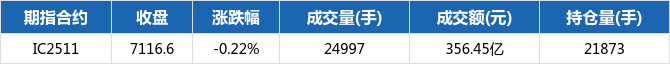 中证500期指当月合约IC2511报收7116.6点,下跌15.6,跌幅0.22%。成交量24997手,成交额356.45亿元,持仓21873手,较上一交易日减少9350。