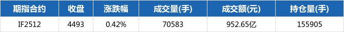 期指主力合约11月26日全涨。其中,沪深300期指当月合约IF2512报收4493点,上涨18.6,涨幅0.42%。成交量70583手,成交额952.65亿元,持仓155905手,较上一交易日减少4903。
