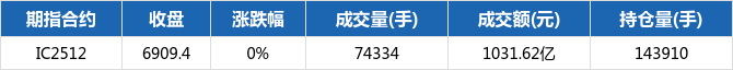 中证500期指当月合约IC2512报收6909.4点,收平,涨幅0%。成交量74334手,成交额1031.62亿元,持仓143910手,较上一交易日减少8529。