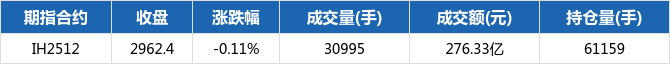 上证50期指当月合约IH2512报收2962.4点,下跌3.2,跌幅0.11%。成交量30995手,成交额276.33亿元,持仓61159手,较上一交易日增加3149。