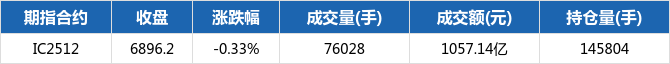 中证500期指当月合约IC2512报收6896.2点,下跌22.6,跌幅0.33%。成交量76028手,成交额1057.14亿元,持仓145804手,较上一交易日增加1894。