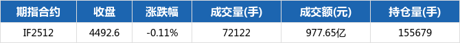 期指主力合约11月27日全跌。其中,沪深300期指当月合约IF2512报收4492.6点,下跌4.8,跌幅0.11%。成交量72122手,成交额977.65亿元,持仓155679手,较上一交易日减少226。