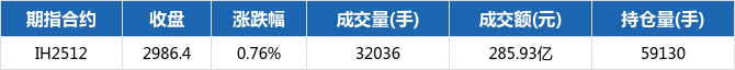 上证50期指当月合约IH2512报收2986.4点,上涨22.6,涨幅0.76%。成交量32036手,成交额285.93亿元,持仓59130手,较上一交易日增加1252。