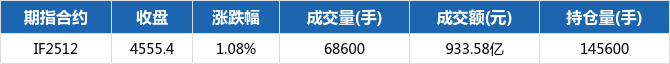 期指主力合约12月1日全涨。其中,沪深300期指当月合约IF2512报收4555.4点,上涨48.6,涨幅1.08%。成交量68600手,成交额933.58亿元,持仓145600手,较上一交易日减少3201。