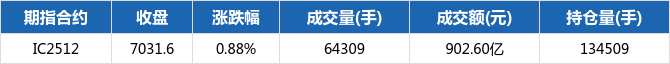 中证500期指当月合约IC2512报收7031.6点,上涨61.4,涨幅0.88%。成交量64309手,成交额902.6亿元,持仓134509手,较上一交易日减少4945。