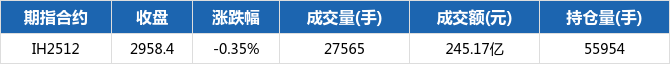 上证50期指当月合约IH2512报收2958.4点,下跌10.4,跌幅0.35%。成交量27565手,成交额245.17亿元,持仓55954手,较上一交易日增加2099。