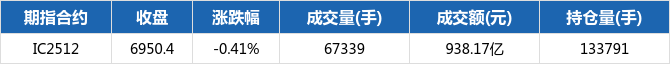中证500期指当月合约IC2512报收6950.4点,下跌28.8,跌幅0.41%。成交量67339手,成交额938.17亿元,持仓133791手,较上一交易日增加6171。
