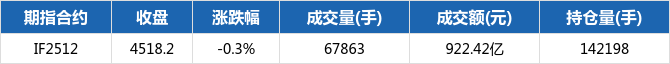 期指主力合约12月3日全跌。其中,沪深300期指当月合约IF2512报收4518.2点,下跌13.6,跌幅0.3%。成交量67863手,成交额922.42亿元,持仓142198手,较上一交易日增加3766。