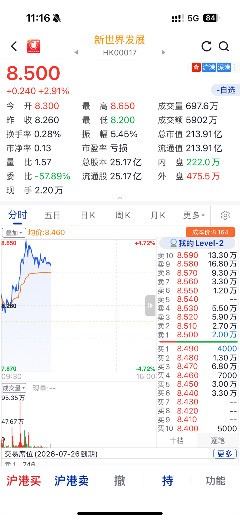 $新世界发展(HK|00017)$ 外盘是内盘的2倍到底是谁在哄抢?外资好心人,明早开盘要T一点