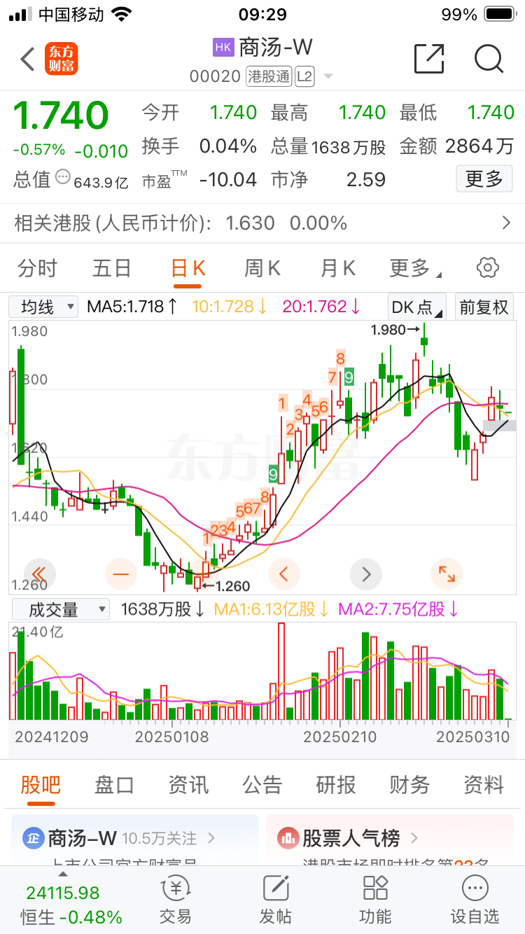 $商汤-W(HK|00020)$ 开盘在各均线上方