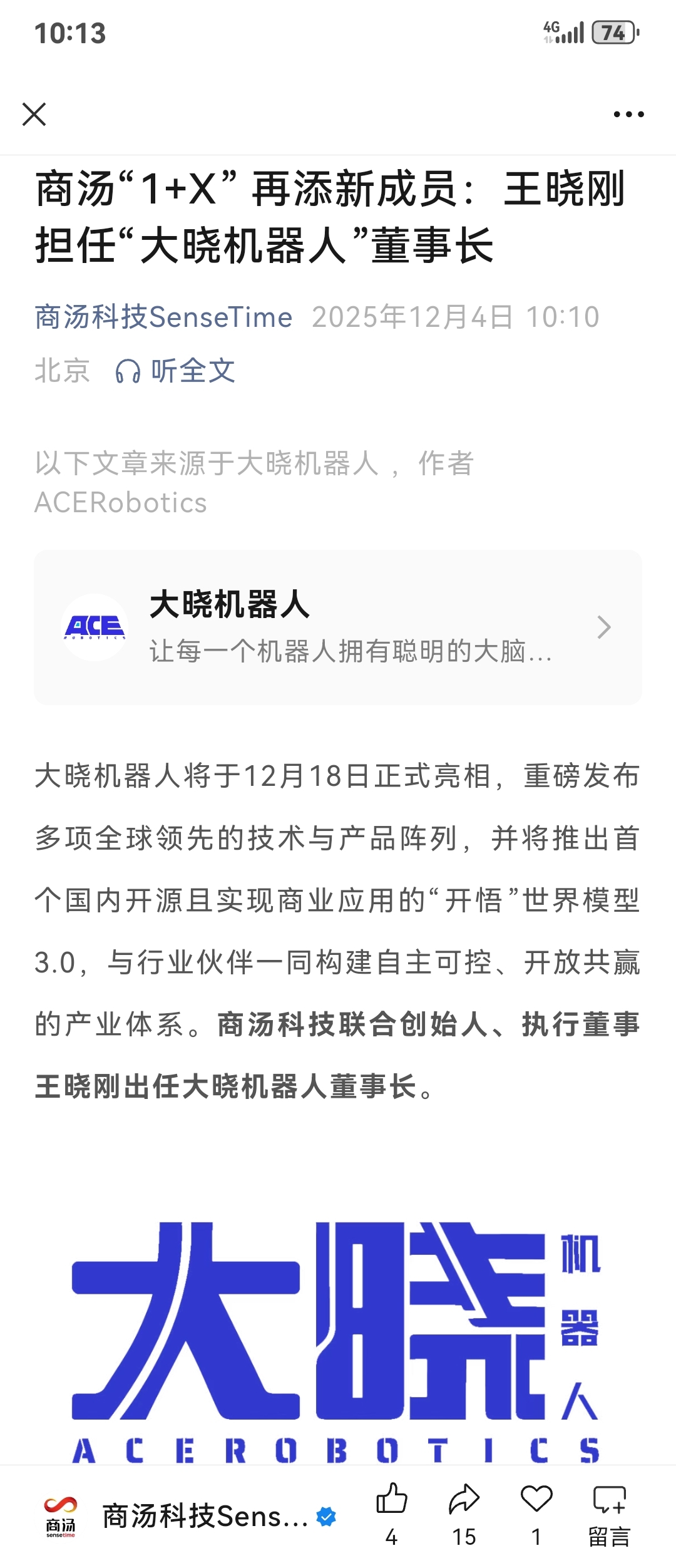 $商汤-W(HK|00020)$ 大晓机器人将于12月18日正式亮相,重磅发布多项全球领先的技术与产品阵列,并将推出首个国内开源且实现商业应用的“开悟”世界模型3.0,与行业伙伴一同构建自主可控、开放共赢的产业体系。商汤科技联合创始人、执行董事王晓刚出任大晓机器人董事长。
