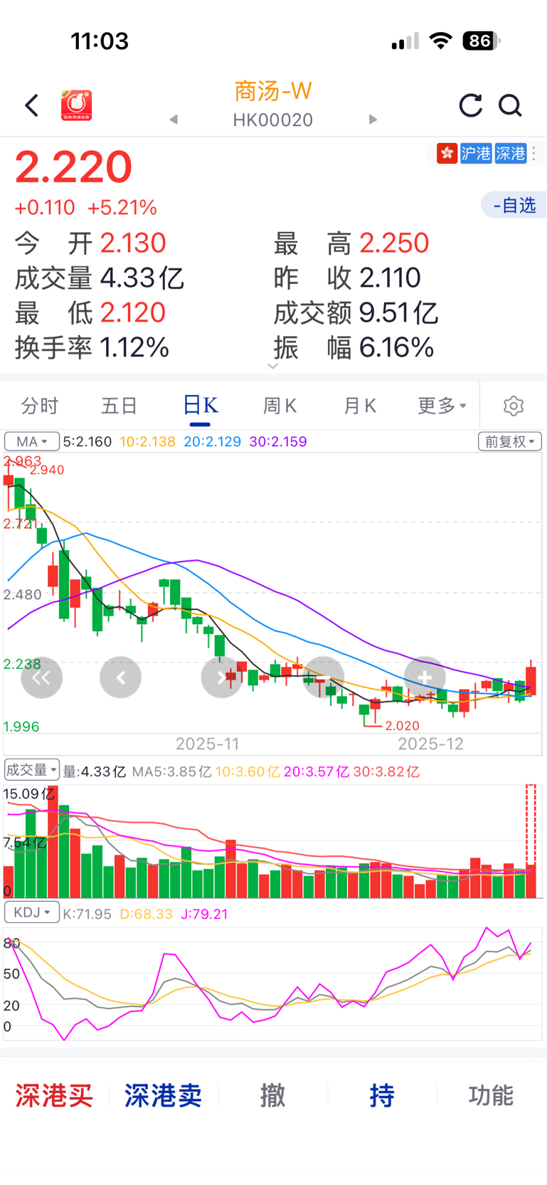 $商汤-W(HK|00020)$ 目前2.22,大机构、散户买入主,放量上涨,猜一猜收盘的价格吧,2.25 65%可能性,你的看法?