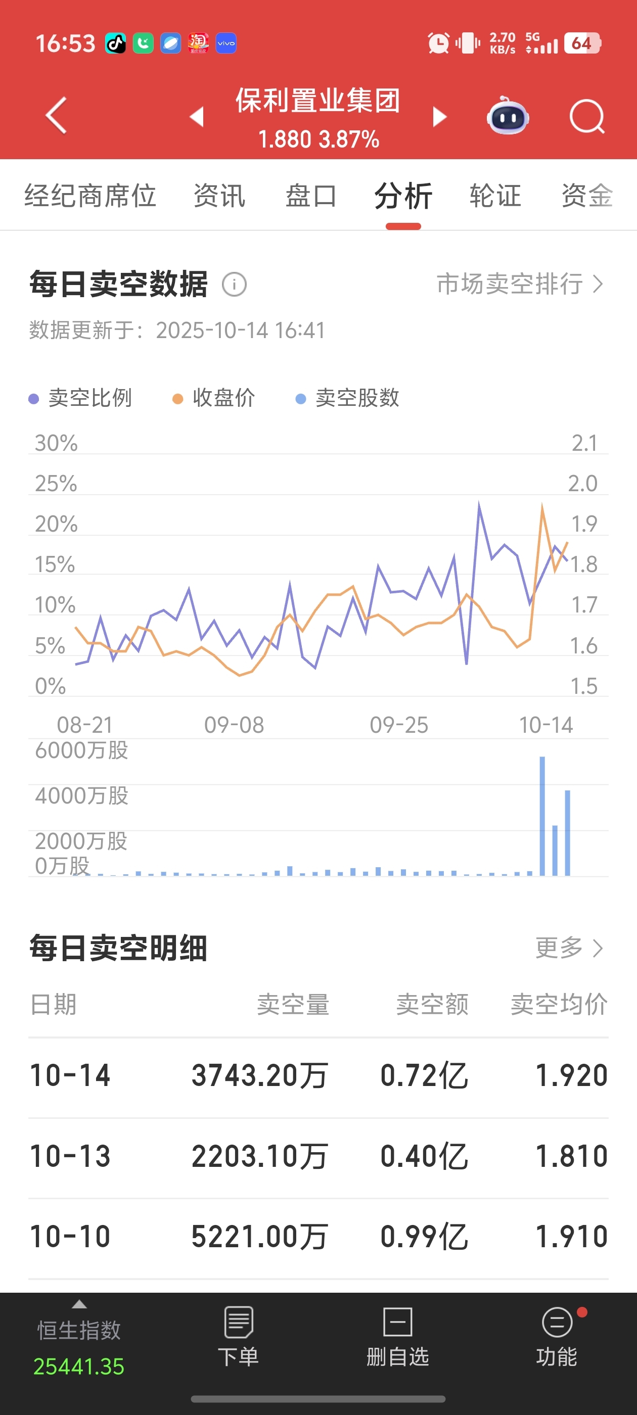 $保利置业集团(HK|00119)$ 空空真疯狂,三天开了一亿多股的空单