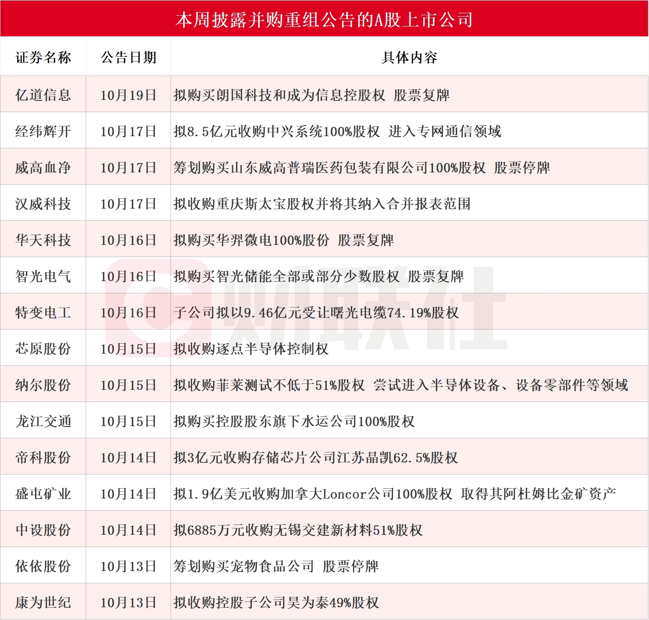 $保利置业集团(HK|00119)$ $保利发展(SH600048)$ 据不完全统计,截至发稿,本周(10月13日-10月19日)包括亿道信息、经纬辉开、威高血净、汉威科技、华天科技、智光电气、特变电工、芯原股份、纳尔股份、龙江交通、帝科股份、盛屯矿业、中设股份、依依股份和康为世纪在内的15家A股上市公司披露并购重组进展最新公告。其中,亿道信息拟购买朗国科技和成为信息控股权,股票将于10月20日开市起复牌。
