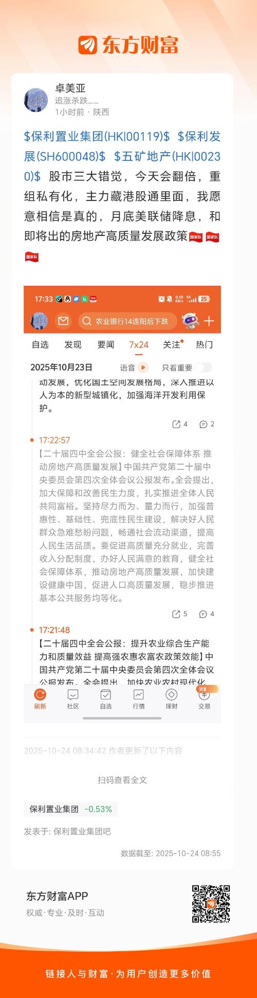 $保利置业集团(HK|00119)$ $保利发展(SH600048)$ $五矿地产(HK|00230)$ 股市三大错觉,今天会翻倍,重组私有化,主力藏港股通里面,我愿意相信是真的,月底美联储降息,和即将出的房地产高质量发展政策