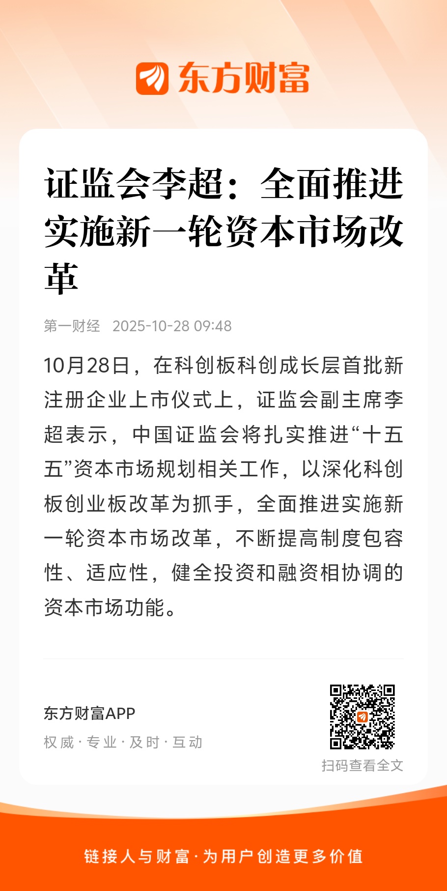 10月28日,在科创板科创成长层首批新注册企业上市仪式上,证监会副主席李超表示,中国证监会将扎实推进“十五五”资本市场规划相关工作,以深化科创板创业板改革为抓手,全面推进实施新一轮资本市场改革,不断提高制度包容性、适应性,健全投资和融资相协调的资本市场功能。