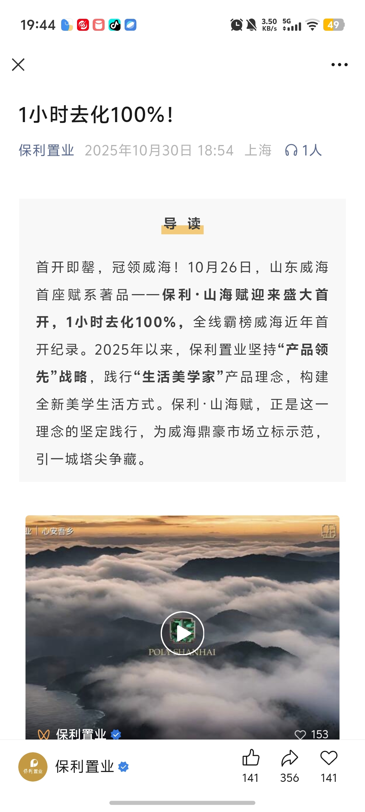 首开即罄,冠领威海!10月26日,山东威海首座赋系著品——保利·山海赋迎来盛大首开,1小时去化100%,全线霸榜威海近年首开纪录。2025年以来,保利置业坚持“产品领先”战略,践行“生活美学家”产品理念,构建全新美学生活方式。保利·山海赋,正是这一理念的坚定践行,为威海鼎豪市场立标示范,引一城塔尖争藏。