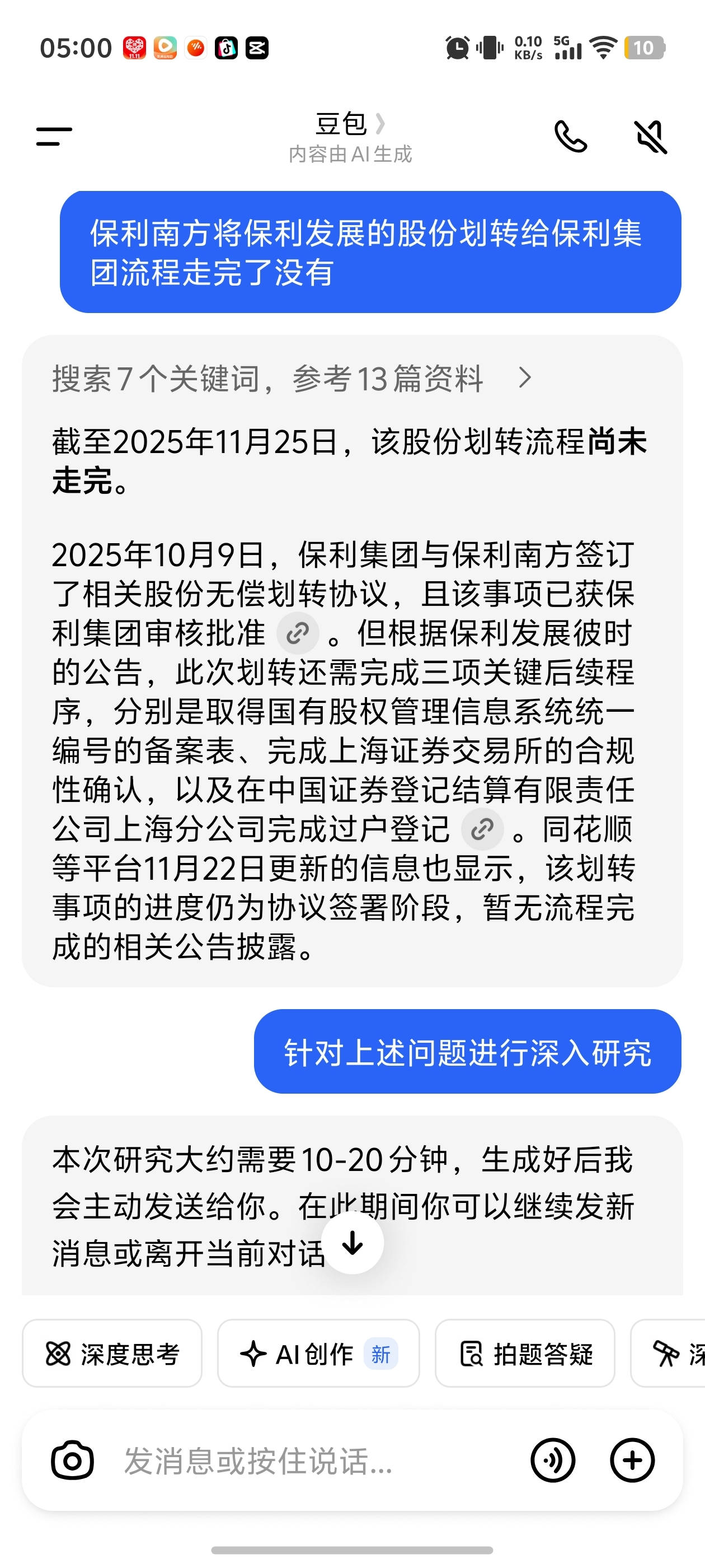 截至2025年11月25日,保利南方将保利发展45.12亿股股份(占总股本37.69%)无偿划转给保利集团的事项仍处于进行中状态。该事项已完成保利集团内部审批和协议签署,但仍需完成国有股权管理信息系统备案、上交所合规性确认和中登公司过户登记三项关键程序。