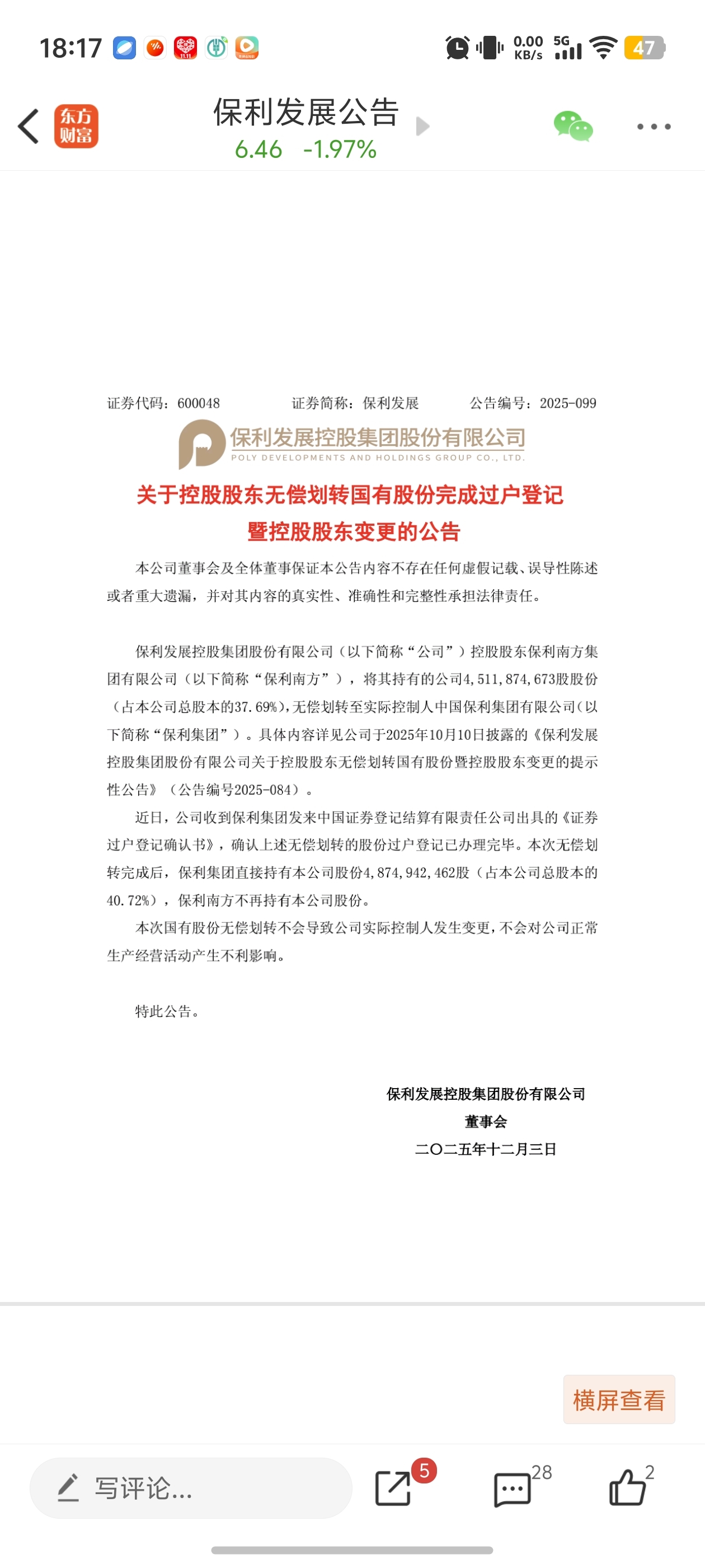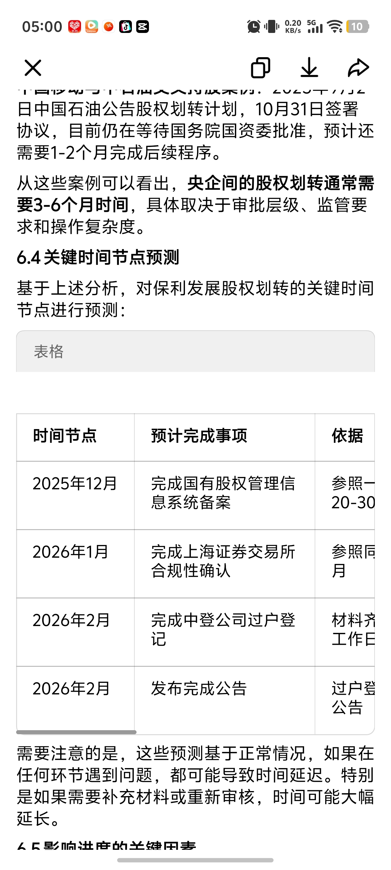 根据《上市公司国有股权监督管理办法》的规定,国有股权无偿划转需在协议签署后6个月内完成过户登记手续 。保利集团与保利南方于2025年10月9日签署《国有股权无偿划转协议》,因此最晚需在2026年4月9日前完成全部过户登记程序。