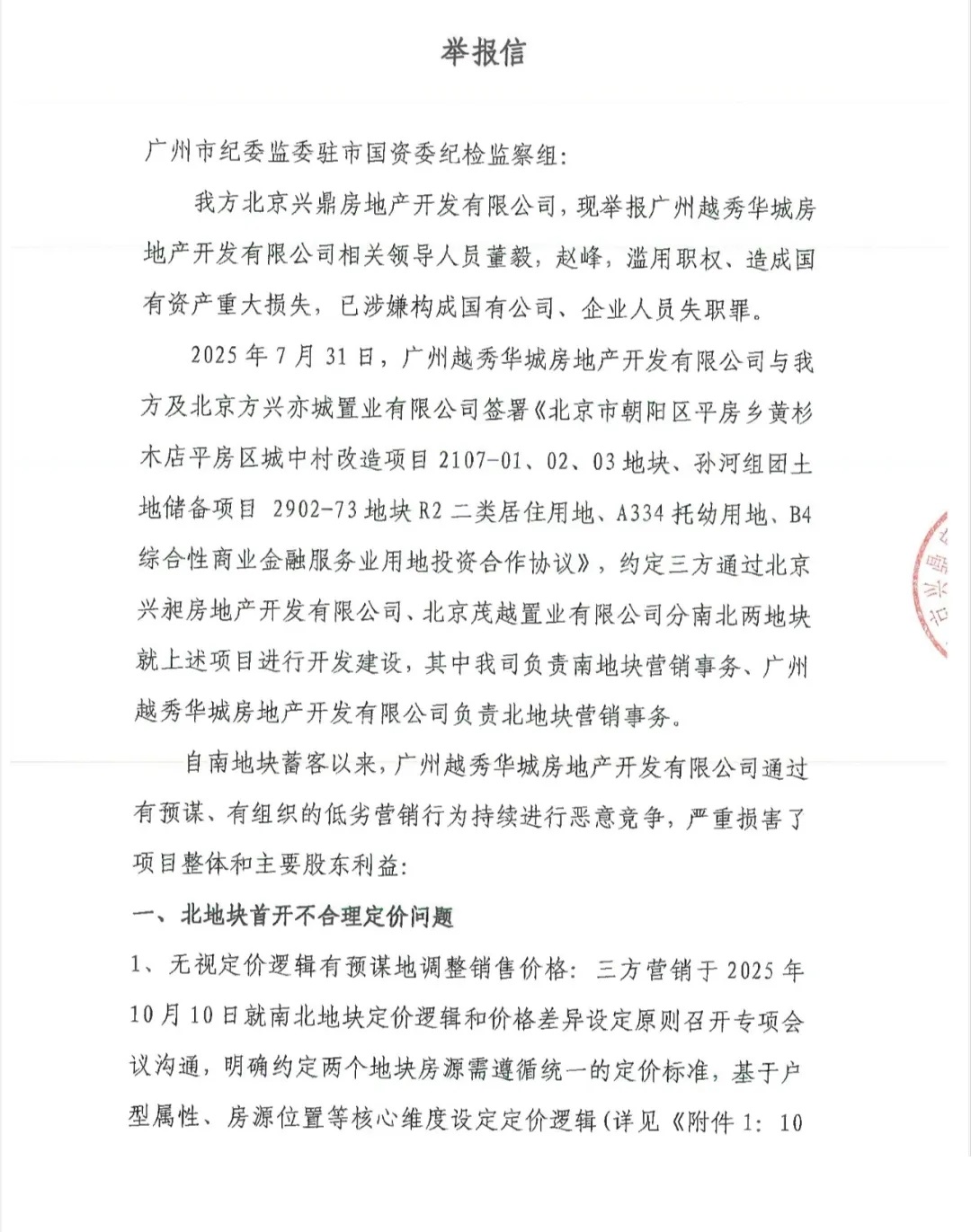 交涉未果后争端继续升级,中建智地向广州市纪委监委驻市国资委纪检监察组发出带有公章和骑缝章的正式举报信,举报广州越秀华城房地产开发有限公司相关领导人员董毅,赵峰,滥用职权、造成国有资产重大损失,已涉嫌构成国有公司、企业人员失职罪。