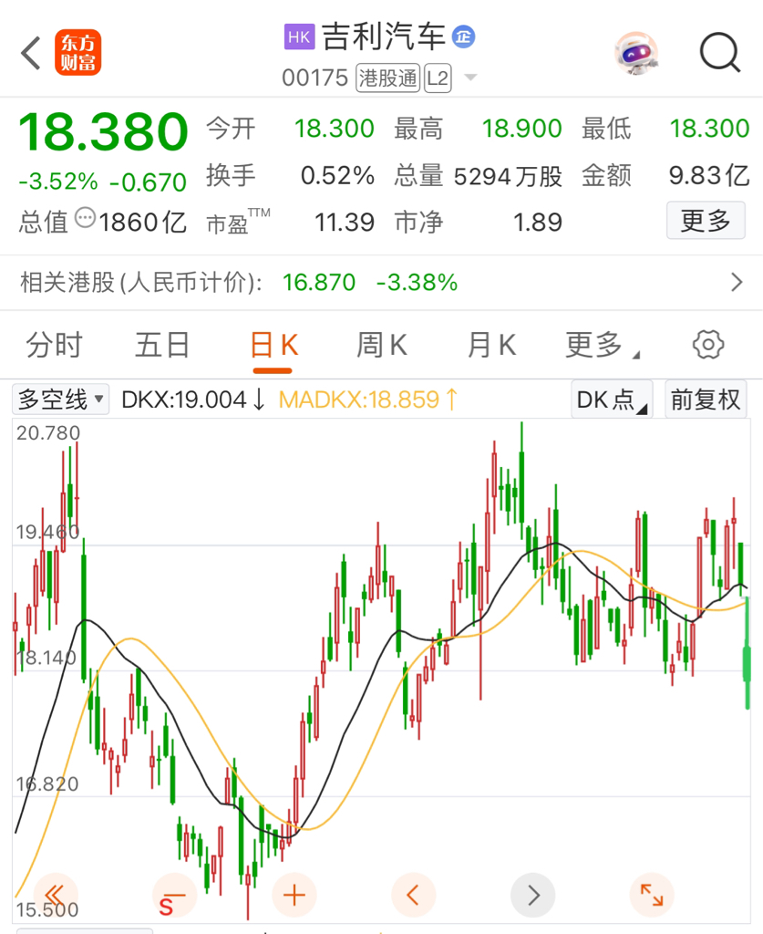 $吉利汽车(HK|00175)$ 下午红柱翻绿柱