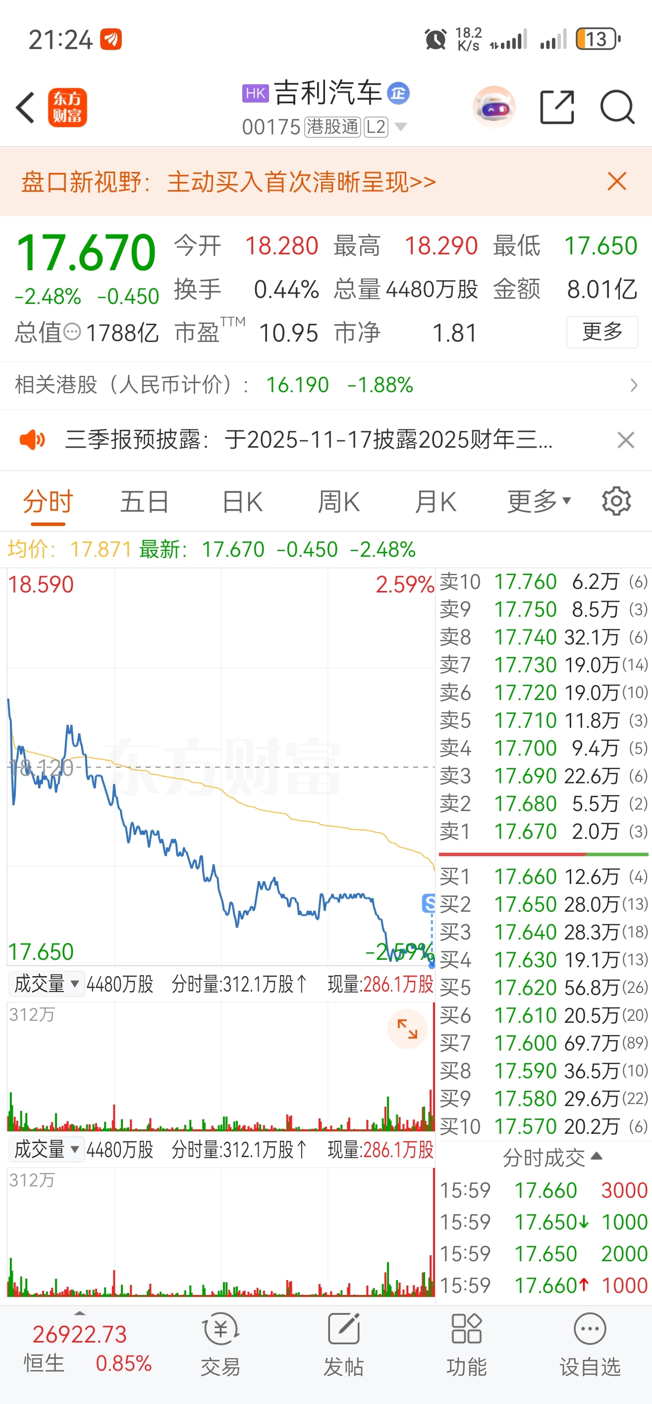 $吉利汽车(HK|00175)$ 我割了,明天必涨,这是大A的勾庄,以后不来了,明天发财