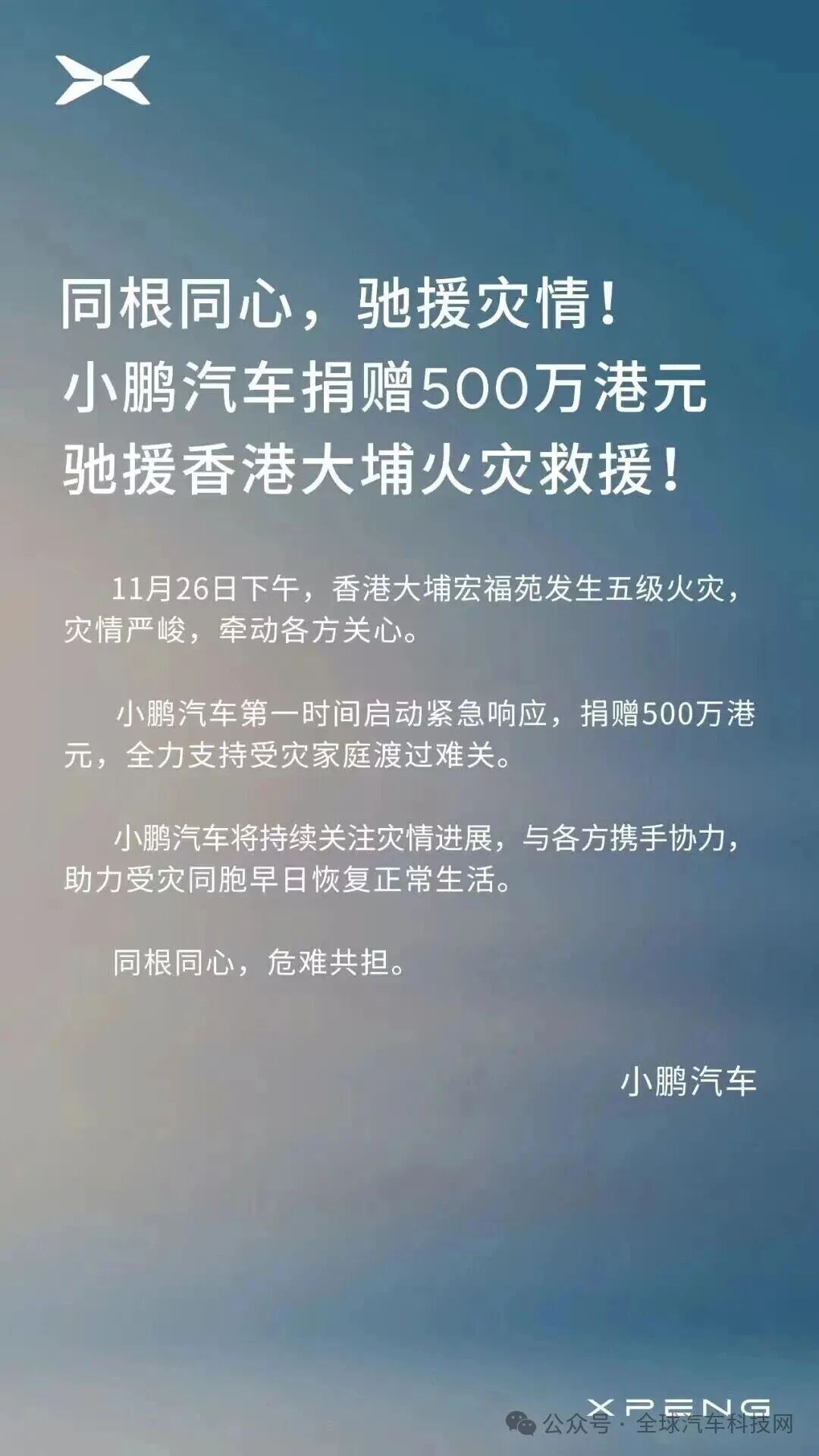 小鹏汽车捐赠500万港元,全力支持受灾家庭渡过难关,并表示将持续关注灾情进展,助力受灾同胞早日恢复正常生活。