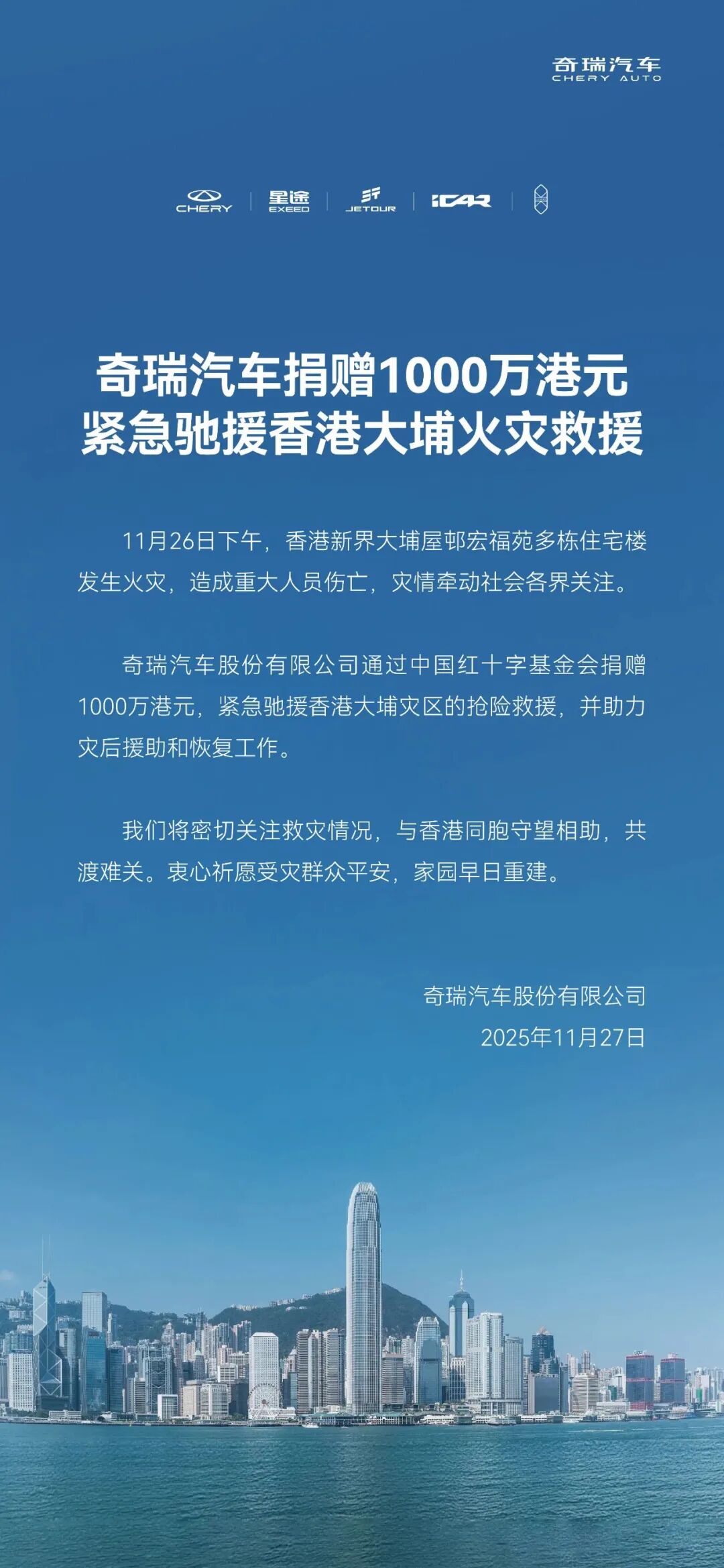 奇瑞汽车股份有限公司通过中国红十字基金会捐赠1000万港元,紧急驰援香港大埔灾区的抢险救援,并助力灾后援助和恢复工作。