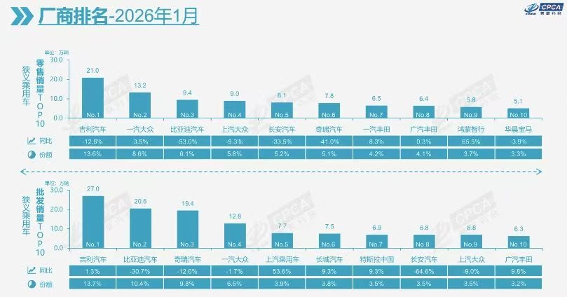 $吉利汽车(HK|00175)$ 1月乘联会数据出炉,吉利汽车以零售21.0万辆、批发27.0万辆的成绩,同时拿下零售与批发销量榜双料冠军,超越比亚迪,零售端市场份额达13.6%,批发端市场份额13.7%,头部趋势明显,开年表现强势领跑行业,在行业整体承压背景下,展现出强劲的市场韧性。