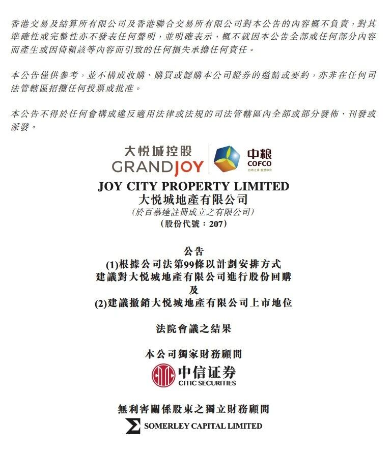 11月17日晚,大悦城地产有限公司(以下简称“大悦城地产”)发布公告称,在当日举行的法院会议上,亲身或委派代表出席法庭会议并投票的计划股东,已批准通过私有化的决议案。待该计划生效后,大悦城地产在联交所的上市地位,预期将于11月27日下午四时正起撤销。