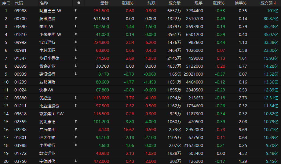 港股成交额前二十