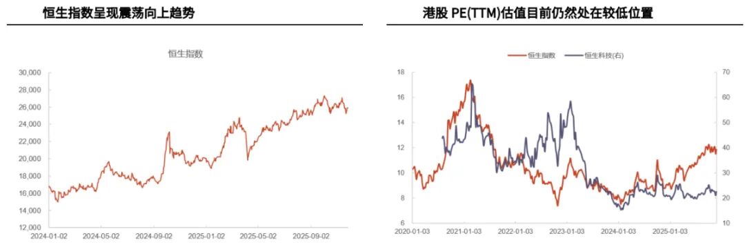 美联储12月有望降息,港股未来或继续震荡上行。港股整体盈利能力相对较强同时互联网、新消费、创新药等资产相对稀缺。此外,尽管港股已经连续多月上涨,但是整体估值仍然偏低,长期配置性价比仍较高。在AI产业趋势持续发展,以及美联储12月有望降息的背景下,港股市场未来或许将继续震荡上行。