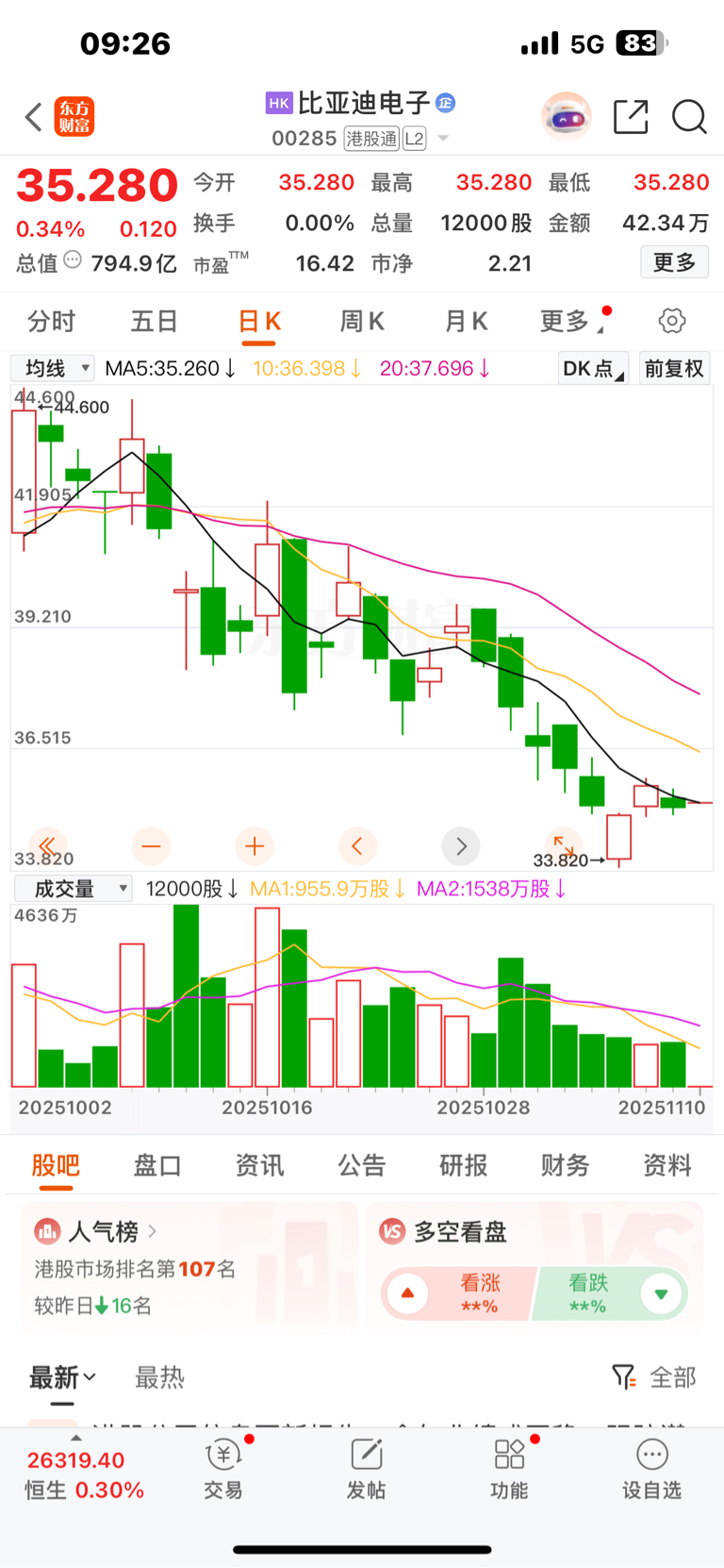 $比亚迪电子(HK|00285)$ 10日线突不破,五日线突破没有连续站稳三日都是弱势,还要一段时间折磨!