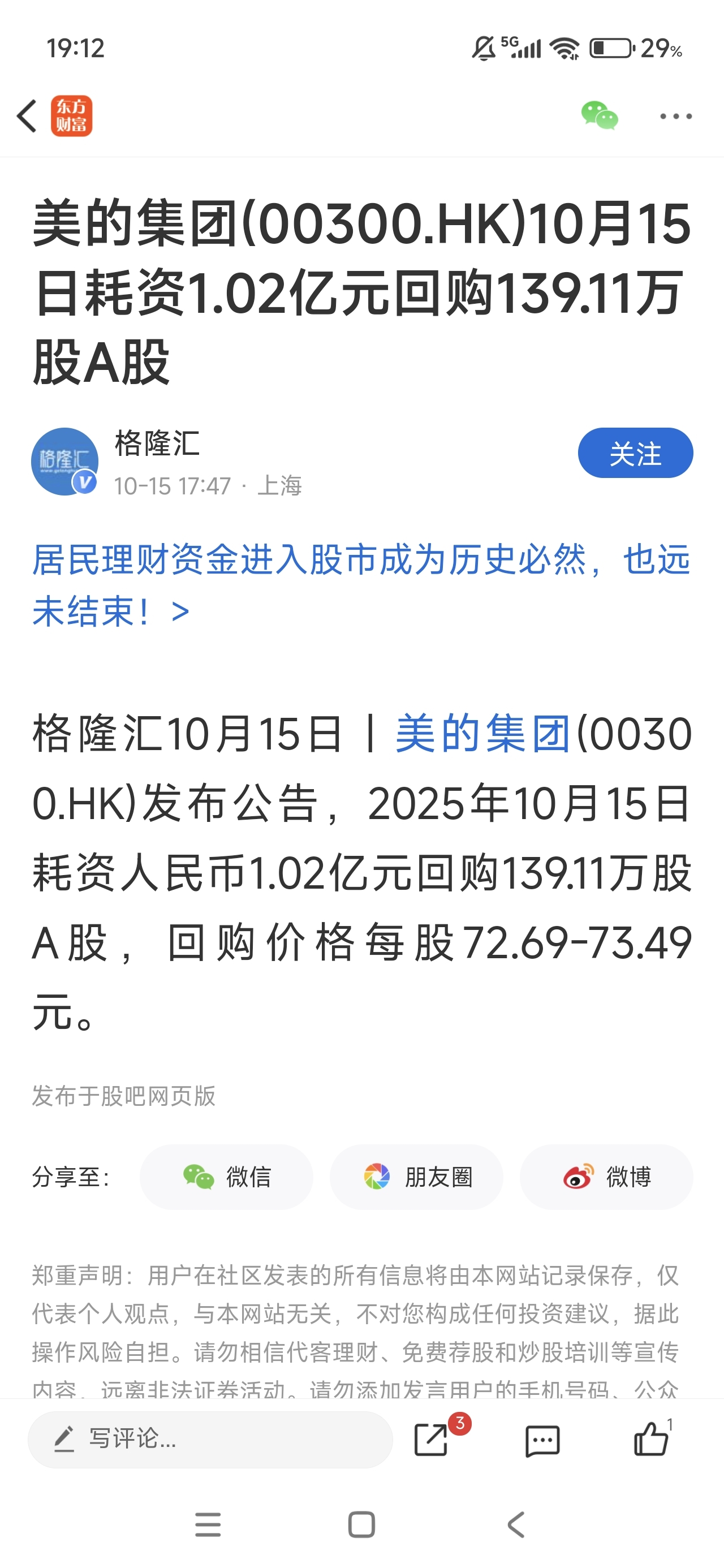 $美的集团(HK|00300)$ 每天回购,什么意思