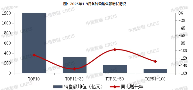 房地产行业的深度调整伴随着结构分化。据中指研究院统计,今年1-9月,TOP100房企销售总额为26065.9亿元,同比下降12.2%。虽然各阵营房企销售额均有下降,但分化显著,TOP10房企销售额均值为1280.9亿元,TOP11-30房企销售额均值为319.8亿元,TOP51-100房企销售额均值仅为74.6亿元,同比下降12.9%。