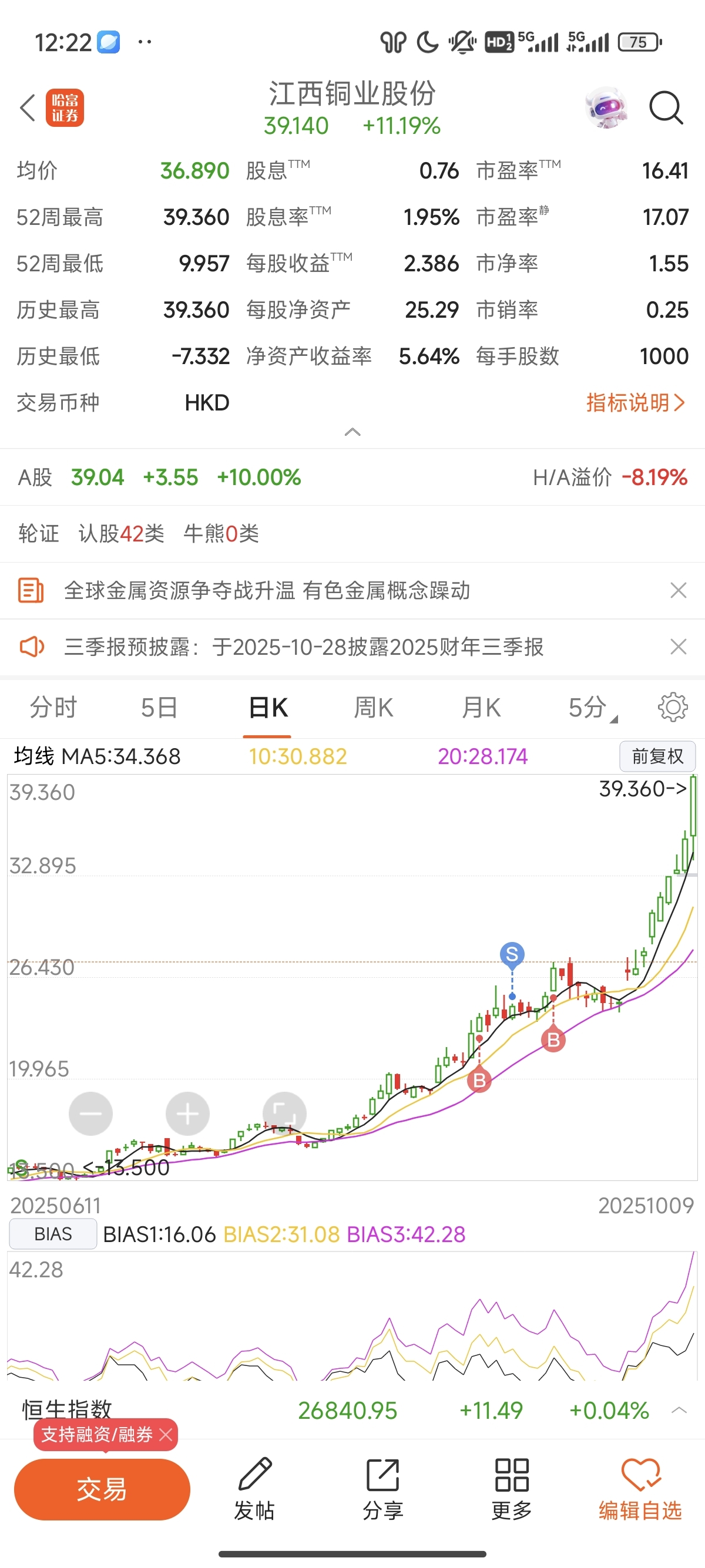 $江西铜业股份(HK|00358)$ 当时买这个还是嫌紫金一手2000略贵不方便t,没想到这个走的最强了,铜需求爆发叠加有色周期,本来看长线的话能涨3-5年,现在自媒体财经新闻盛行,街头大妈看抖音也知道这个板块好了,单个板块的趋势性长牛,可能会变成短时间的主升爆发了。