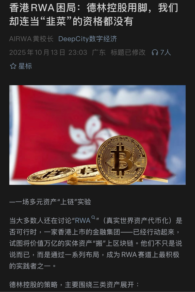 德林控股的“出走”,并不是放弃香港,而更像是一封写给现实的谏言:RWA的未来,绝不能只是少数人的游戏。