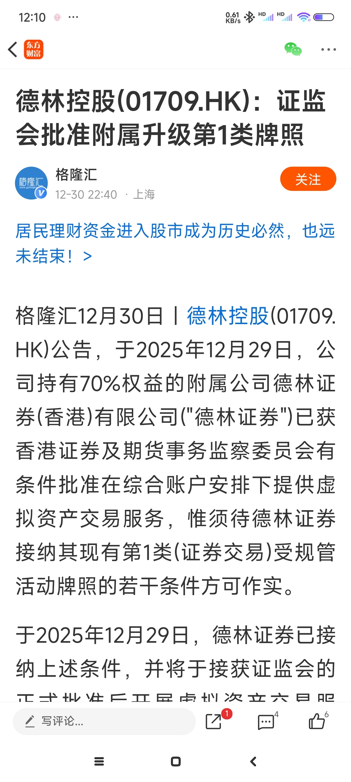 $云锋金融(HK|00376)$ $国泰君安国际(HK|01788)$ $德林控股(HK|01709)$ 德林控股虚拟牌照今天通过了,吃六倍的机会又来了~~~